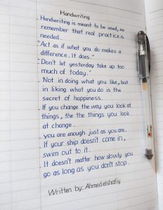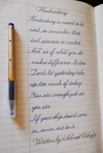 الخطاط أحمد الشافعي ابن محافظة بورسعيد درس بكالوريوس كلية تجارة قسم محاسبة يبلغ من العمر ٣٠ عاما ،هو نموذج مشرف لجميع الشباب ومحب للكتابة منذ صغره وطور من نفسه بالقراءة في شتى المجالات المرتبطه ،فهو لديه موهبة الكتابة بثلاث خطوط ،وتميز خطه باللغه الإنجليزيه بالخط المشبك،لم يكتفي بهذا بل اشتغل علي جميع من حوله واهتم أكثر بالاطفال في تحسين خطهم باللغتين وعلمهم ٤ خطوط وبالتدريج ومع التدريب يوصل إلى٨خطوط ،واستهدف هذه الفئة لكي يخرج جيل متأسس جيدا في الكتابة ويعلم كيف يكتب بطريقة سليمة ومنظمة و كما أنه يعمل علي تشجعيهم ونشر كتابتهم علي مواقع التواصل الاجتماعي وكما أنه يعلم أون لاين ،وفي بدايه تنفيذ الفكرة واجه صعوبات وتحديات ولكنه لم يستسلم في يوم لاي انتقادات أو احباطات ولكنه أصر علي هدفه ونجح فيه بشده وهو يسعي أن يفتتح أكاديمية خاصة به ونشر فكره تحسين الخط في كل بيت في مصر وخارج مصر ولهذا كان لنا معه حوار خاص وممتع في هذا السياق