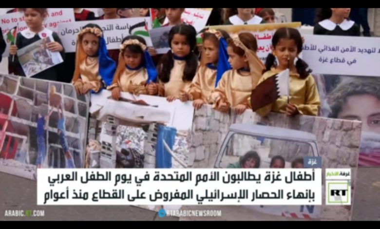 نظّم الأطفال في قطاع غزة وقفة أمام مكتب برنامج الأمم المتحدة الإنمائي، في يوم الطفل العربي، مطالبين بحقِّهم في العيش بكرامة، بعيدًا عن الحصار الإسرائيلي المفروض على القطاع.
