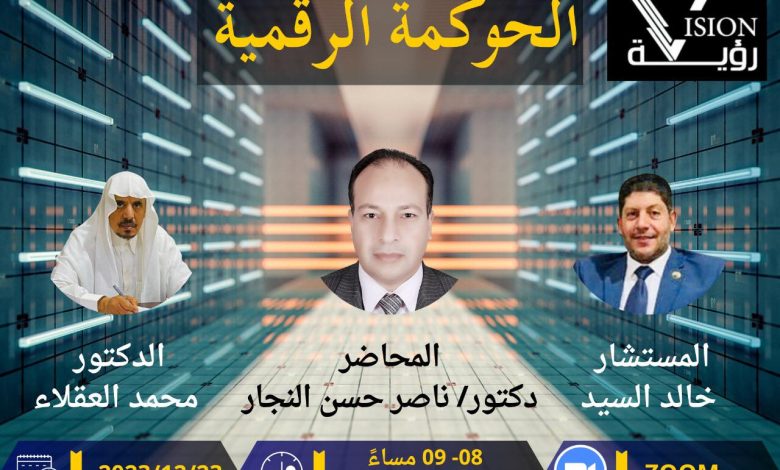 صرح المستشار التنفيذي خالد السيد عن انعقاد ملتقى الحوكمة الرقمي بالمملكة العربية السعودية عبر برنامج زووم في تمام الساعة 08:00مساء بتوقيت القاهرة الموافق 23/12/2023م برعاية مبادرة الرؤية القانونية وشركة رؤية للمحاماة والتدريب و قد ترأس الملتقى الدكتور محمد العقلاء متحدثا عن. الحوكمة الرقمية ركيزة التحول الرقمي حيث يعيش العالم حالياً عصر تسارع وتتطور التكنولوجيا الرقمية بشكل سريع حيث يشهد التطور التكنولوجي تأثيرات هائلة في مختلف جوانب الحياة الاقتصادية والاجتماعية يساهم التحول الرقمي في تحسين الكفاءة وتسهيل العديد من العمليات والخدمات من أجل تحقيق هذا التحول بشكل فعّال ومستدام ويأتي دور الحوكمة الرقمية لتوجيه وإدارة هذه التقنيات، حيث إن الحوكمة الرقمية تعبر عن الهيكل الذي يدير ويوجه استخدام التكنولوجيا الرقمية في مؤسسات ومنظمات مختلفة حيث تشمل مجموعة من السياسات والإجراءات والممارسات التي تهدف إلى ضمان فعالية استخدام التكنولوجيا والبيانات الرقمية وتحقيق الأهداف المرجوة، وللحوكمة الرقمية اهمية يثنى عليها حيث ان الحوكمة الرقمية تلعب دوراً حيوياً في تحسين أداء المؤسسات، حيث تسهم في تحديد الاتجاهات الاستراتيجية وضمان استخدام التكنولوجيا بشكل يعزز كفاءة العمليات، وحماية البيانات، وضمان أمانها وسرية استخدامها، وتحقيق التوازن بين الابتكار والتحكم حيث تعمل الحوكمة الرقمية على تحقيق توازن بين دعم الابتكار وضرورة التحكم والامتثال للقوانين واللوائح