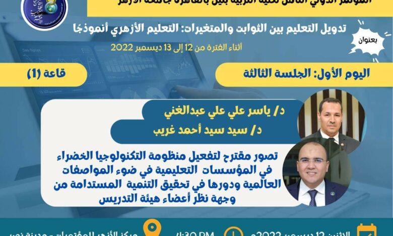 أريد أن أنوه عن حدث عظيم يخدم الإنسانية على أرض مصرية يقام للمرة الثامنة بكلية التربية جامعة الأزهر بالقاهرة بمشاركة عباقرة العلم ونخبة من الأساتذة الجامعيين يشاركون فى مؤتمر تدويل التعليم الجامعي بغاية نبيلة تهدف إلى تطبيق ذلك بمصر فى ضوء المعايير الدولية والمواصفات العالمية يعقد المؤتمر يومى الإثنين والثلاثاء 12و13/12/2022 بجامعة الأزهر بمشاركة الدكتور/ياسر على على البدرشينى الاستاذ المساعد بكلية تكنولوجيا المعلومات جامعة الأزهر الشريف والدكتور/سيد سيد احمد غريب المشارك ببحث جديد فى مجالات تكنولوجيا تكنولوجيا التعليم.