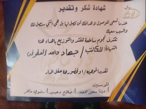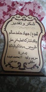 من ضمن أهم التكريمات إني حصلت علي درع شكر في حفل ملتقي مبدعين بدمياط لتكريم الام المثالية وتكرمت ايضا من الإتحاد الشباب العربي