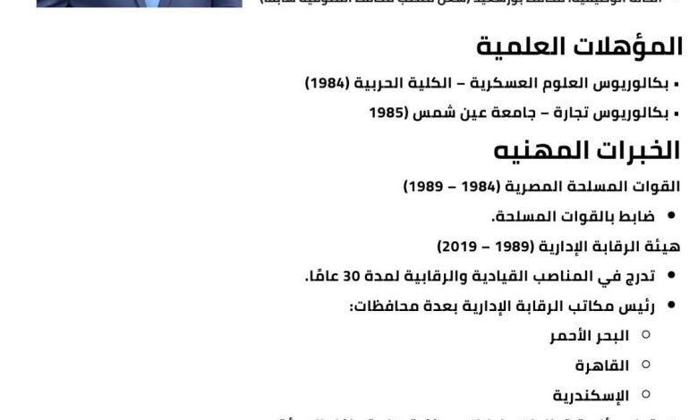 • الحالة الوظيفية: محافظ بورسعيد (شغل منصب محافظ المنوفية سابقًا)
