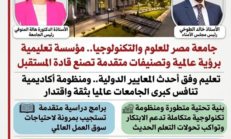 الخلاصة: على مدار أكثر من ربع قرن، لم تكتفِ جامعة مصر للعلوم والتكنولوجيا بكونها رائدة الجامعات الخاصة في مصر، بل تحولت إلى نموذج يحتذى به في المواءمة بين التميز الأكاديمي والمسؤولية المجتمعية، لتظل دائماً “الخيار الأول” لمن يبحث عن تعليم يصنع المستقبل.